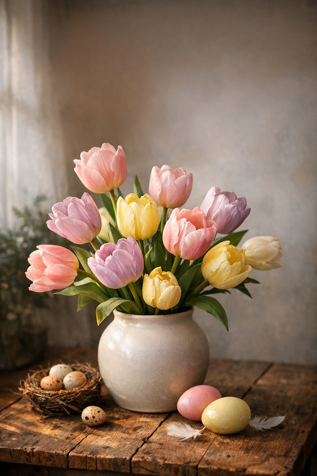 For a special touch, arrange your tulips in a basket with some Easter grass or wrap them with a pastel ribbon. You can also add some baby’s breath or greenery to complement the tulips without overwhelming them.