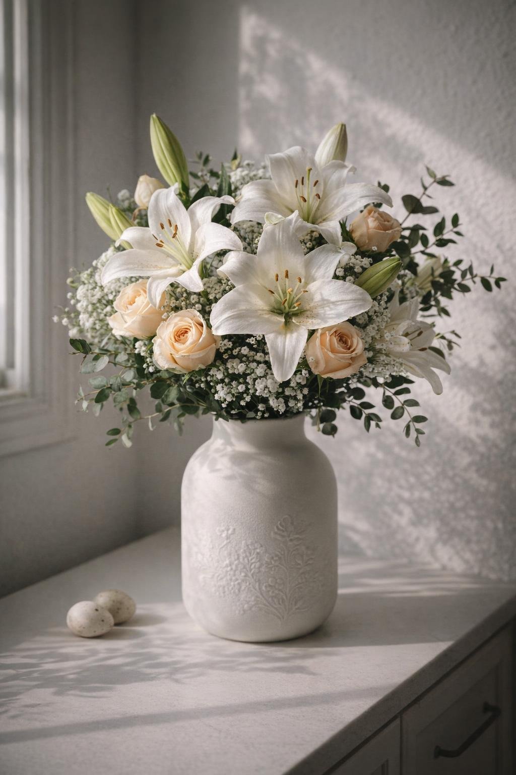 For a modern twist, try pairing Easter lilies with pastel-colored roses or tulips. The contrast between the pure white lilies and soft colored companions creates a beautiful balance.