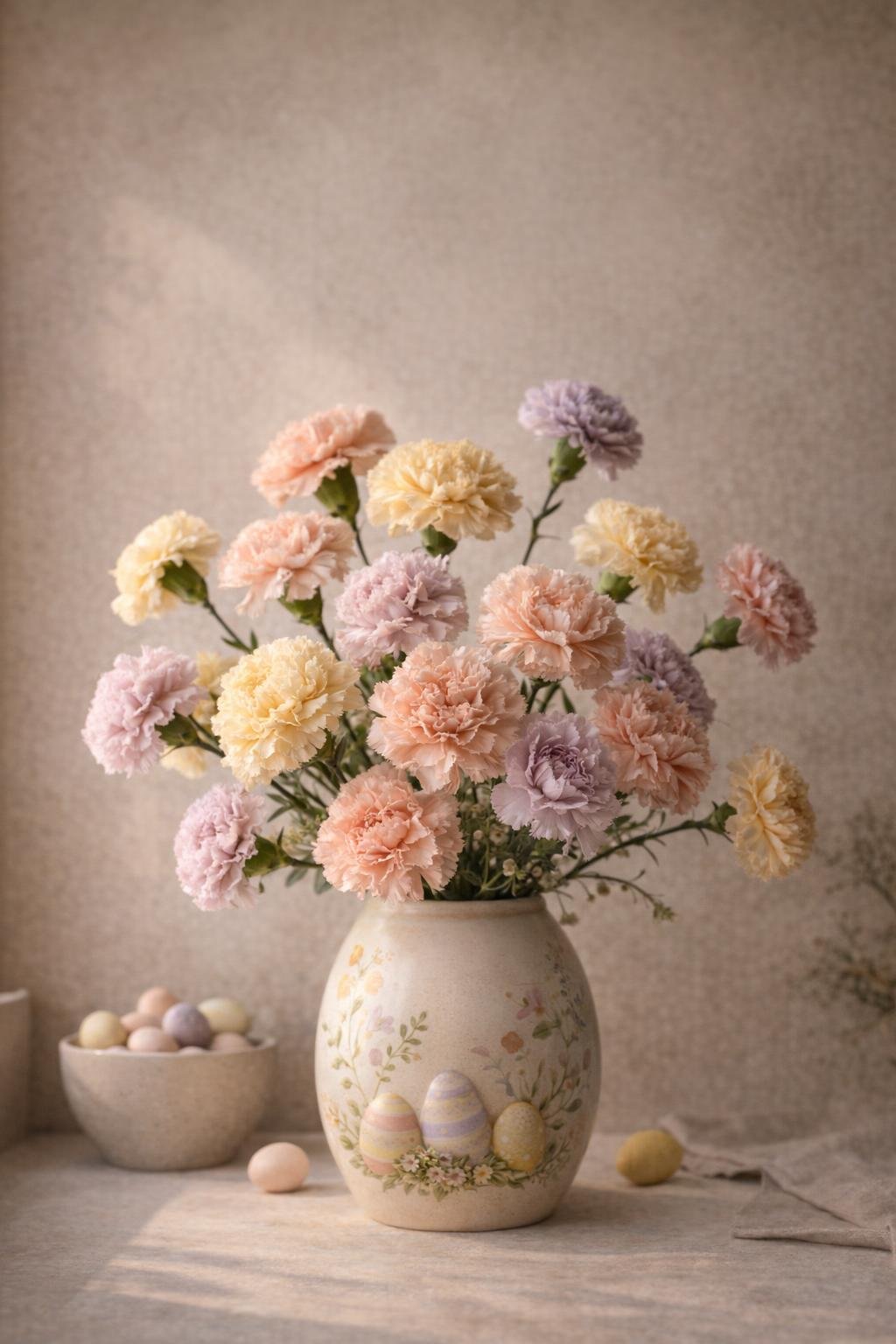 A simple mason jar filled with colorful carnations makes a perfect Easter centerpiece or gift. You can tie a pastel ribbon around the jar for extra holiday charm.