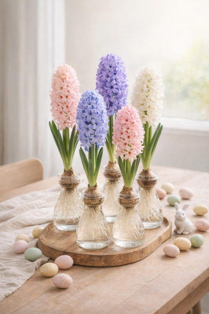 For a simple but elegant arrangement, place 5-7 hyacinth stems in a clear glass vase. Add some decorative Easter eggs at the base of the vase for a festive touch.