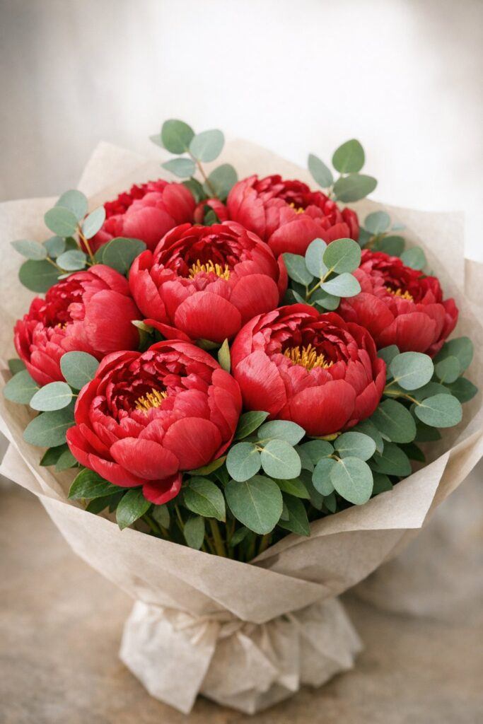 You get a soft, full look when you pair red peonies with eucalyptus. The peonies bring big blooms and rich color that stand out fast.